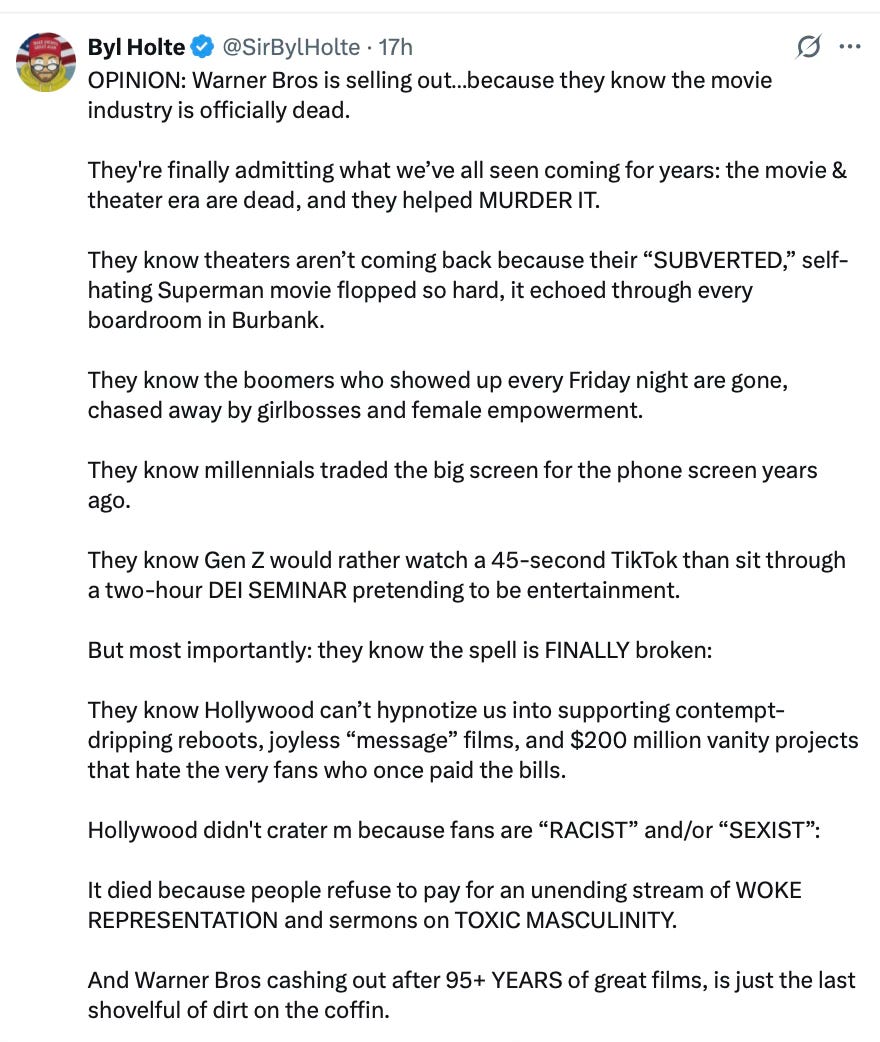 Who knows, maybe Congress or Trump can stop the merger. That still won’t fix the fundamental problem of what Hollywood has become and why the public turned away.