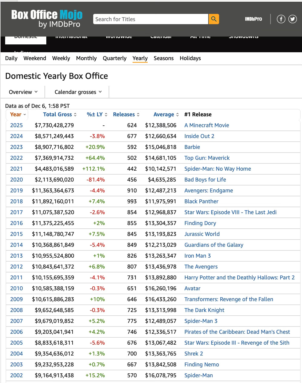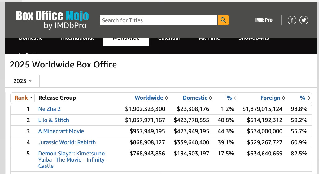 This year might mean that, for the first time since 2020, China will dominate the Worldwide box office rather than Hollywood, unless Jim Cameron can bring Avatar: Fire and Ash over the 2 billion mark.