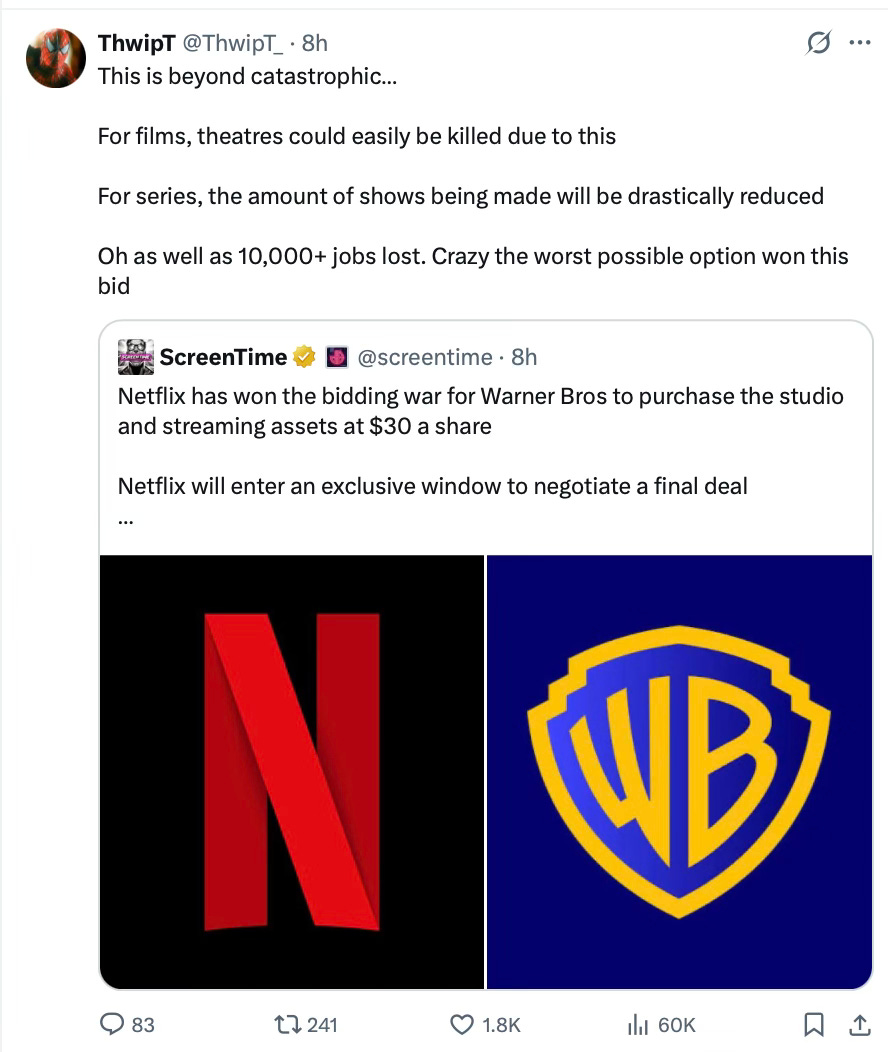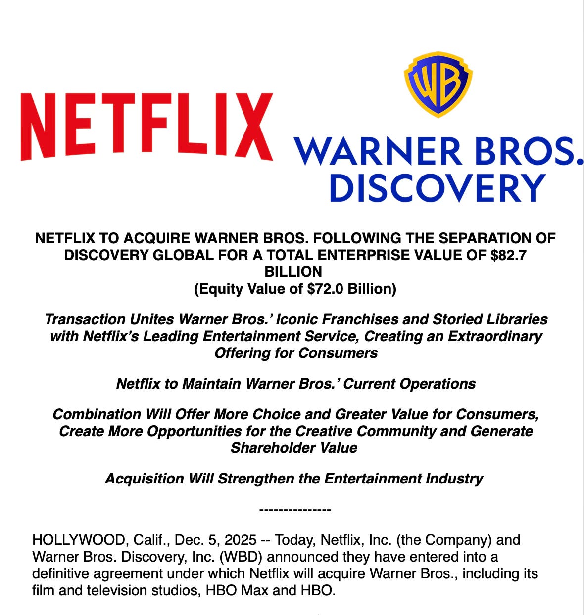 The deal is done. Netflix will purchase Warner Bros. Discovery for $82 billion. Yet another corporate monopoly drives a nail through Hollywood’s coffin. It was bad enough when Disney bought Fox, Star Wars, and Marvel. Now, Netflix will be among the most powerful corporate monopolies, replacing what Hollywood used to be.