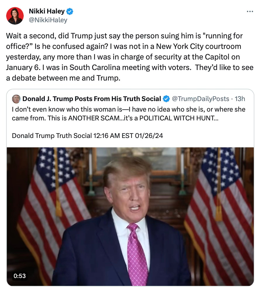 That isn’t to say that Trump isn’t going at Haley like he did Ron DeSantis and everyone else. He calls her “Birdbrain” and has threatened for donors of hers to be barred permanently from the MAGA movement.