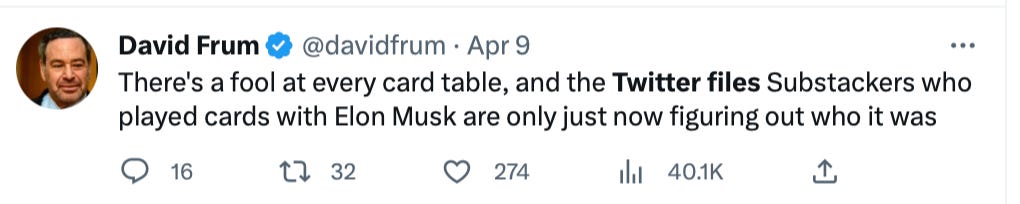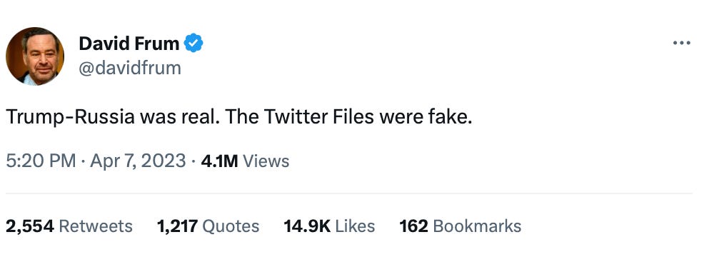 What a sad state of affairs when people like David Frum, your classic blue-check, marinate in their own smug satisfaction. Their fame, such as it is, being a big fish in a tiny pond, hopelessly addicted to the hearts and the RTs. Imagine being a guy who did matter once, now having to turn to a flattering reflecting pool to feel a tiny flicker of importance.