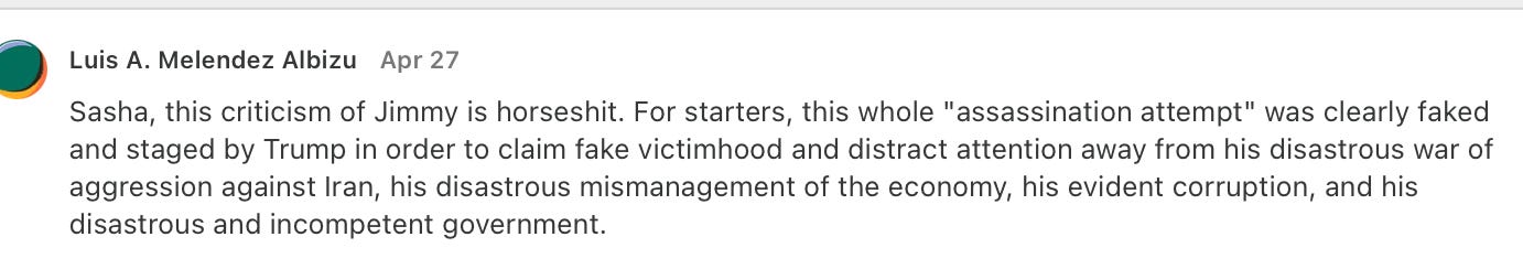 So I agree with you there, Luis. Where we part ways is with your delusion that the assassination attempt was staged. If they let Cole Allen go without charges or if he was pardoned, then maybe. But there is zero chance of that. So why would he agree to spend his entire life in prison for this?