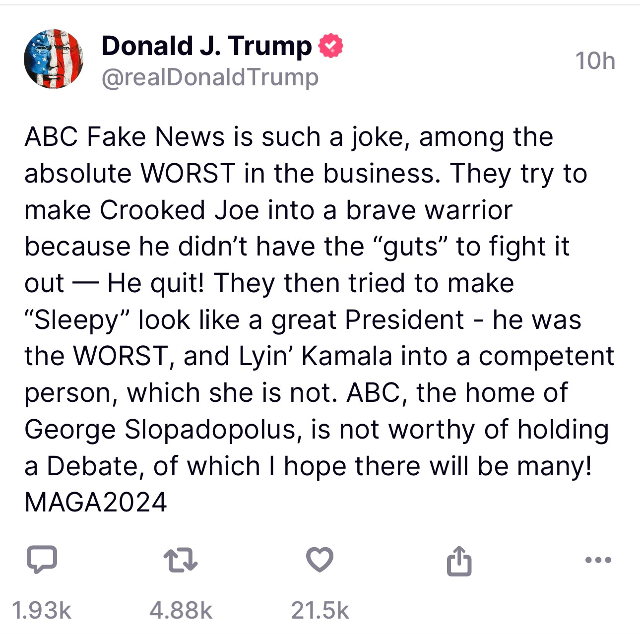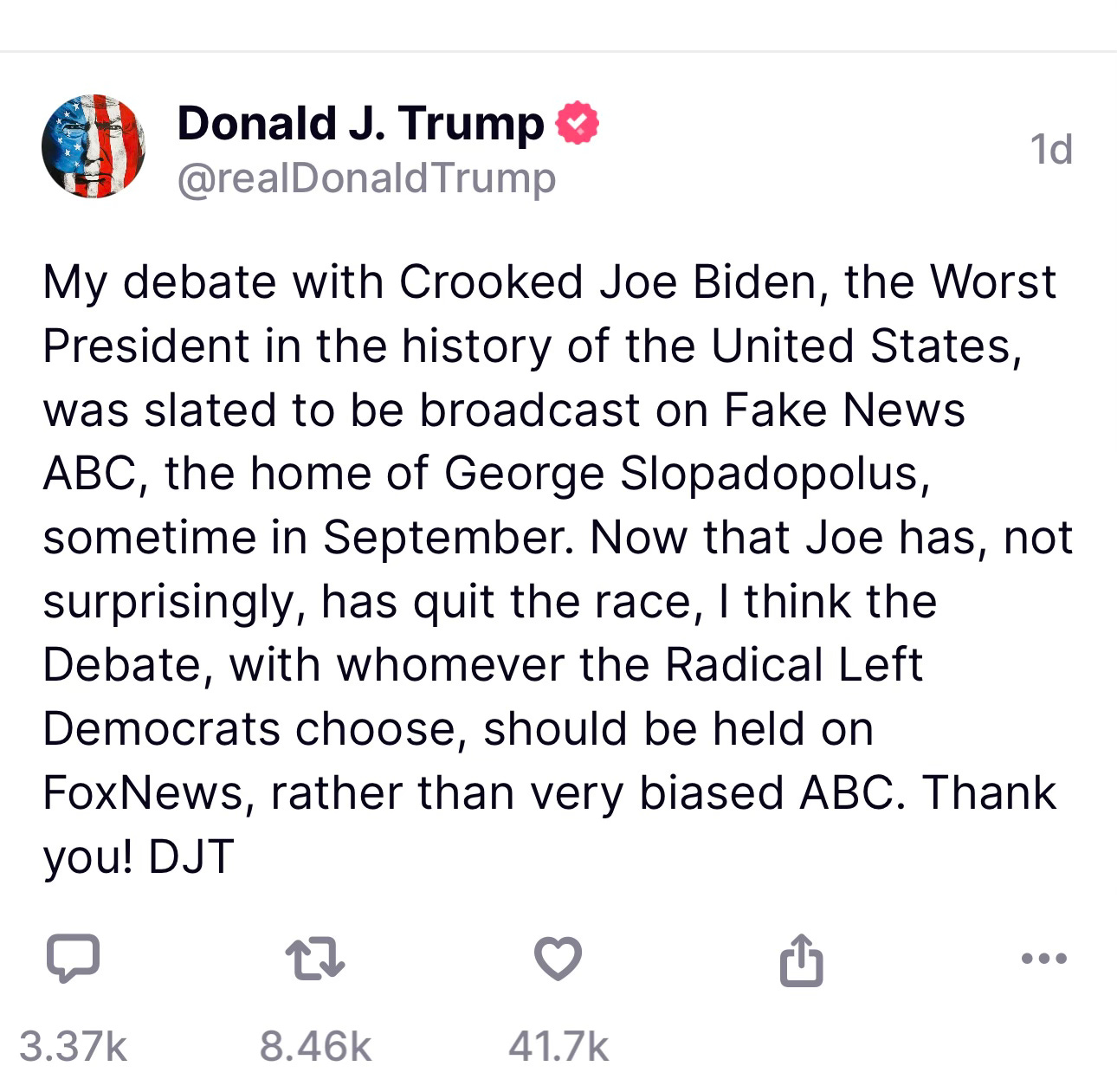 Trump suggested, via Truth Social, that the debate be held on Fox and not CBS. I personally think, and no one should listen to me because what do I know, that Trump should opt out completely. He is not obligated to validate this corrupt process of “selecting” a candidate.