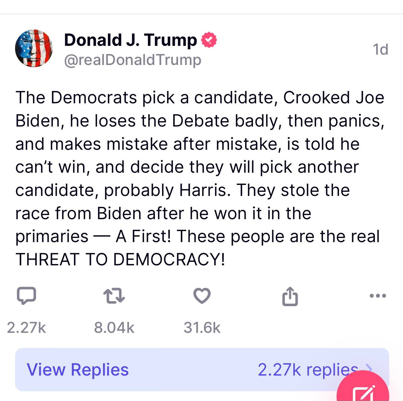 What the Democrats just did and what they will continue to do is anything but Democracy. They're projecting when they claim Trump ends Democracy. They just ended it this weekend. A candidate who has never won a primary vote is being coronated and I don't think it matters what happens in any debates. It's all theater.