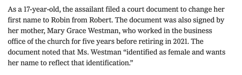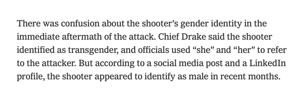 Her home? She traveled? Before turning her weapon on herself? Was the shooter a woman? If so, wouldn’t that be the lede? After all, it’s rare for any woman to be pulled into violence online, let alone go on a shooting spree. Sure, there was Audrey Hale out in Tennessee, but according to the Times, she wasn’t even a SHE. Back in 2023, they awkwardly opted out of using any pronoun to describe Hale, adding this to their story: