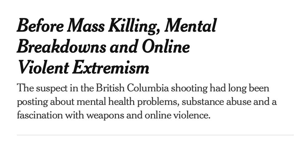 Using that logic, we’d have no choice but to conclude that two women had committed these acts of violence in Minneapolis and now, in Canada, while one male went on a shooting spree in Tennessee. Make it make sense, New York Times.