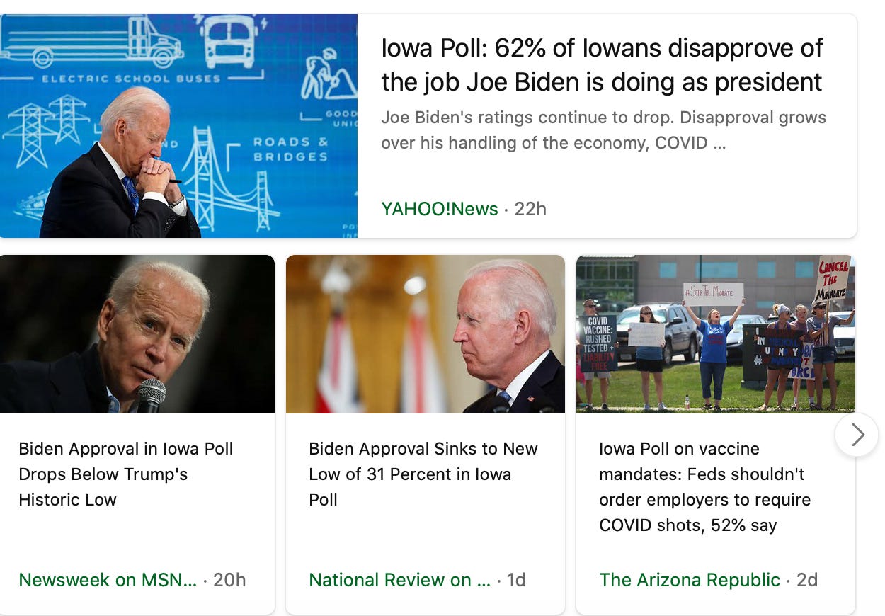 We lose so much when we lose touch with the truth. In science, art, history, music, journalism and yes, the Emmys - none of these things matter if they’re built on illusions and delusions. The recent poll in Iowa is a truth so unbearable the Democrats and their media will do everything they can to try to change how Iowans see Biden. And the Democrats. They will use all of the tools at their disposal to do this. But, as we saw with Afghanistan and now at the border, twitter can only do so much before real life starts to bleed through the pristine surface.