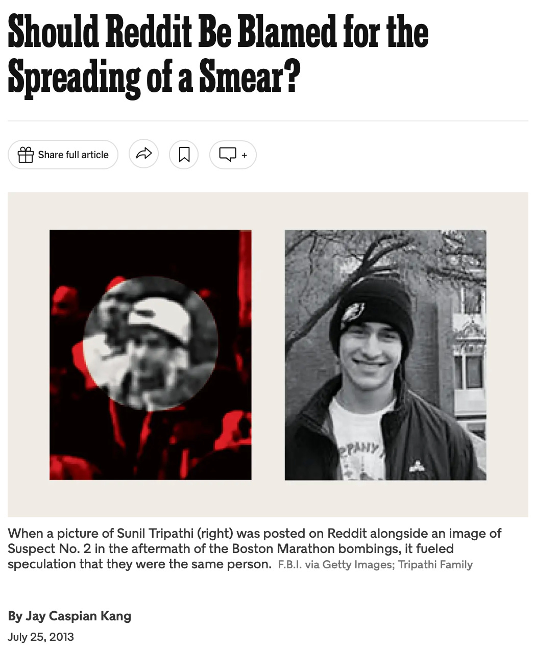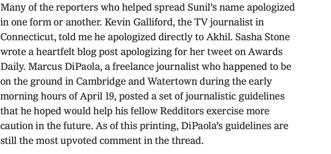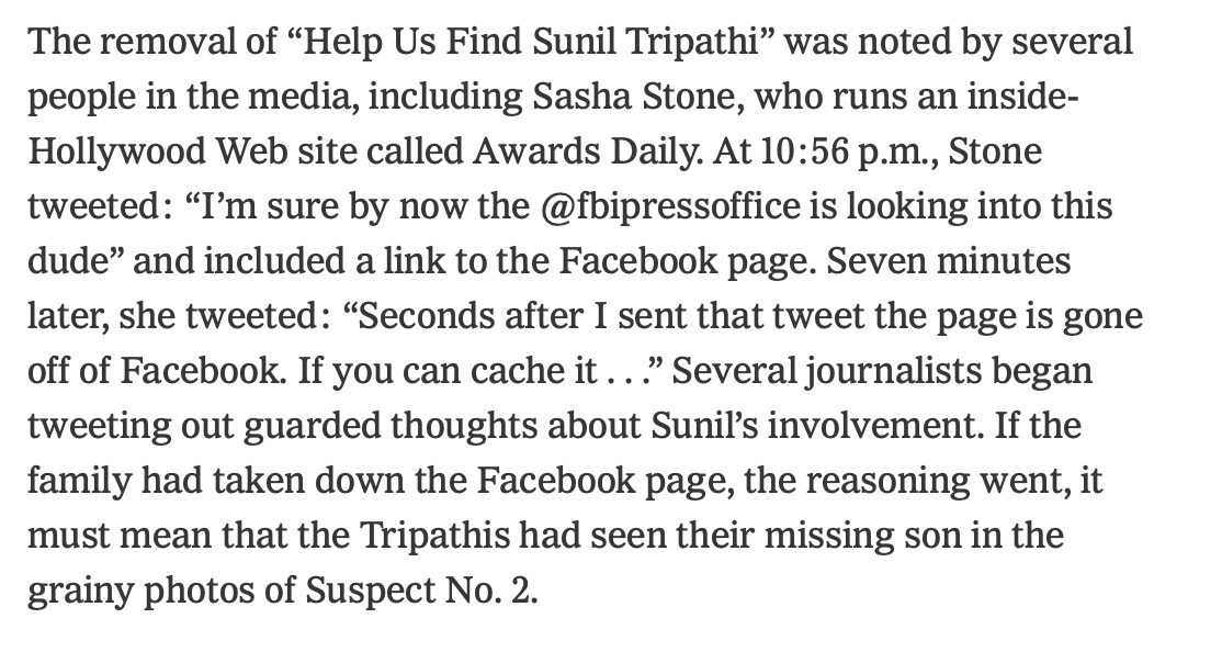 But that story would turn out to be false. That student, Sunil Tripathi, had committed suicide a month earlier. It was both a scandal that we’d all rushed to judgment to smear an innocent man, not to mention putting his already grieving family through yet more suffering, and an opportunity for “old media” to warn the public of “new media” when it came to spreading a lie far and wide.