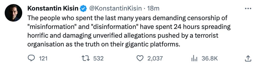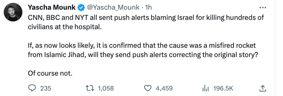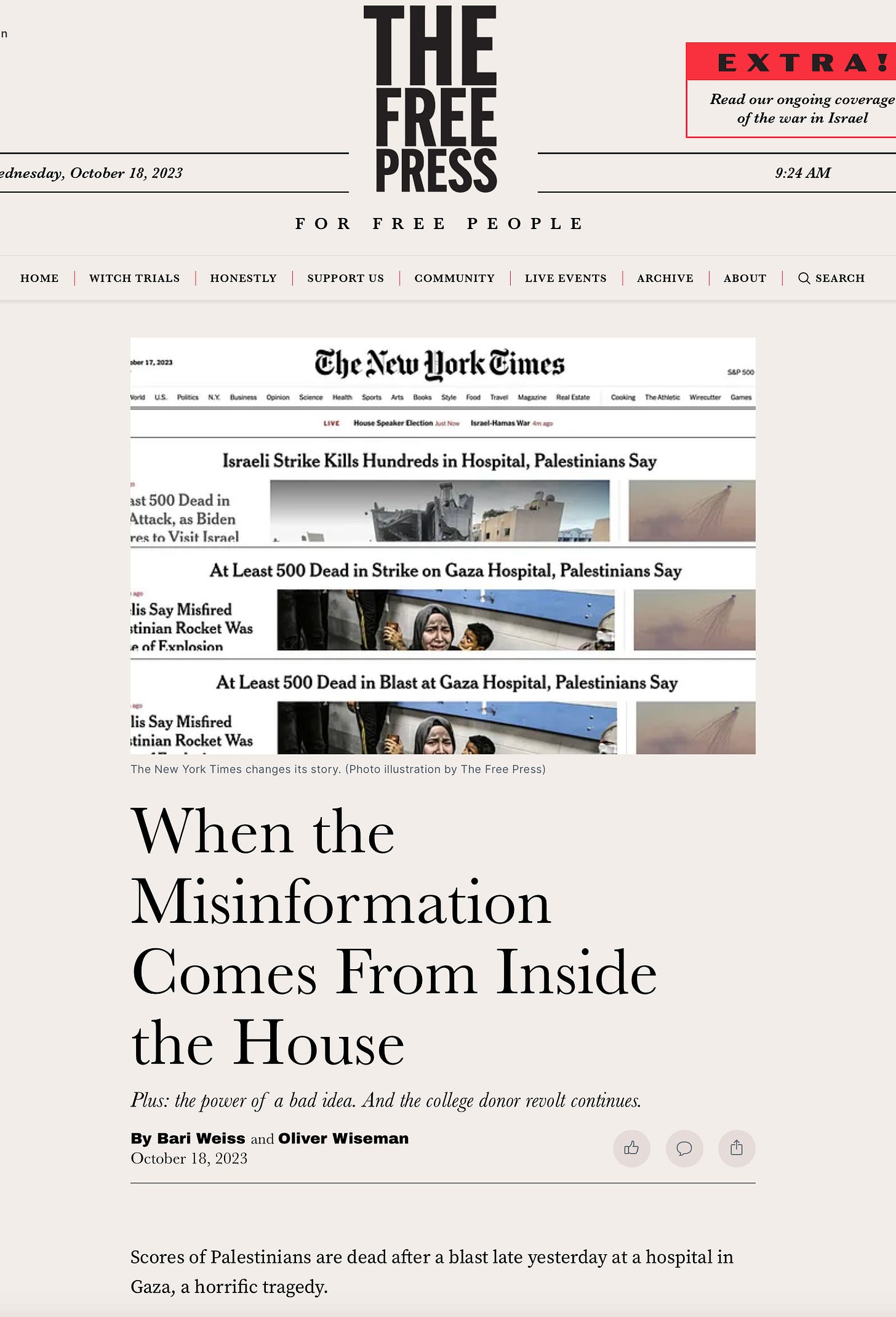 It is the height of irony that Bari Weiss, who resigned at the Times after the Cotton essay, built the Free Press that now exposes the NY Times’ behaving exactly like Twitter back in 2013 and getting the story so wrong in reporting that Israel bombed a hospital in Gaza: