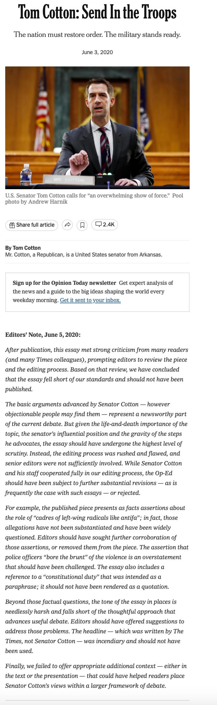 The proof that the Times no longer prioritized information and truth above the needs of fragile, entitled, spoiled people on their own staff and on Twitter was the controversy over the infamous Tom Cotton essay, “Send in the Troops.”