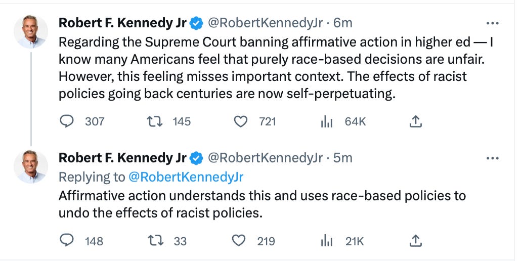 Exactly my thoughts ref RFK Jr’s tweet. I agree with his position on vaccines; bought his book The Real Anthony Fauci. But wow, this tweet of his completely destroyed any other thoughts about his candidacy. Of course he’s much better than dementia Joe or gruesome Newsom, but what a typical Democrat politician in regards to the black community needing ‘our help’ to achieve. Good grief, we’ve had a black president, a black SC Justice--how much higher can a black expect to go?