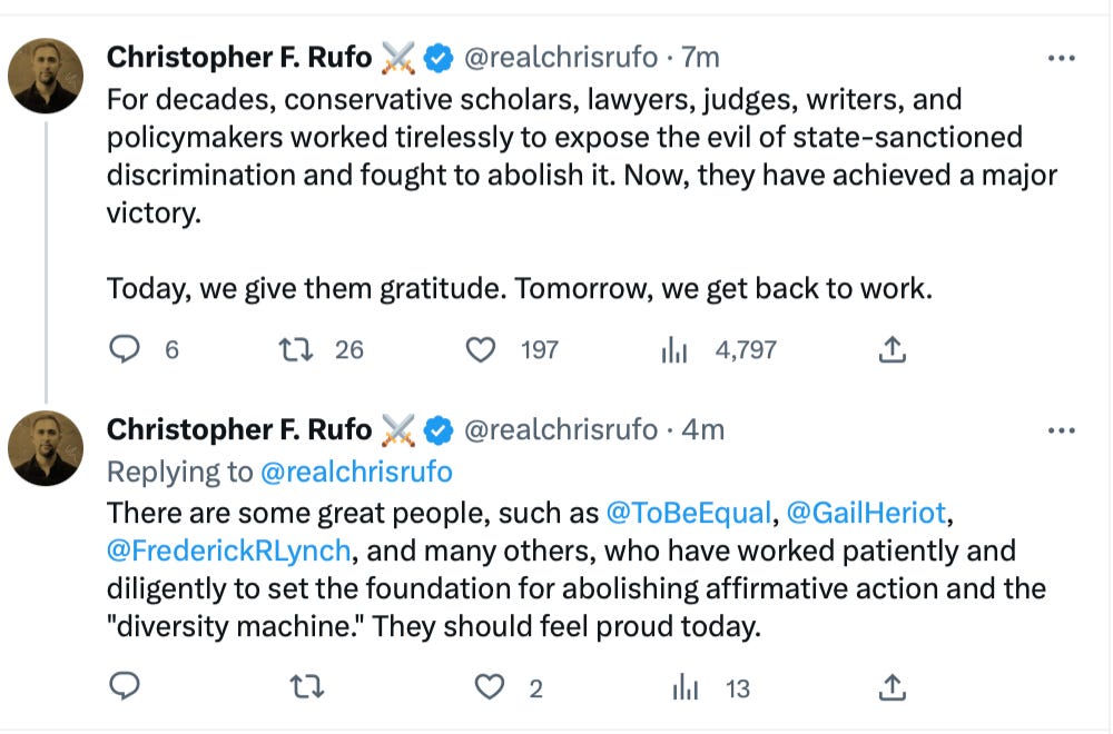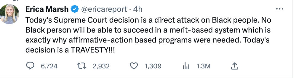 And from Coleman Hughes: ”I am in the latter camp. I think “Affirmative Action” is a misguided, discriminatory policy whose end is long overdue. But I know many intelligent and well-meaning people who disagree. In the coming weeks, I expect many media outlets to push an alarmist viewpoint that we have dialed the clock back to the days of Jim Crow. So I’d like to lay out, as clearly as possible, my reasons for believing that this decision is a net good for American society. “ — 10 Notes on the End of Affirmative Action