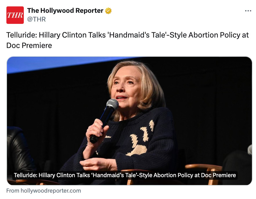 Also here, Hillary Clinton backing an abortion documentary called Zurawski vs. Texas.