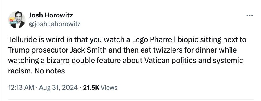 I’ve been coming to the Telluride Film Festival for 14 years and I’ve never seen it so chock full of Democrats and the policies they care about. Just today, prosecutor Jack Smith was wandering down the street. He’s been here seeing films. Whether he is here for any specific reason, I do not know.