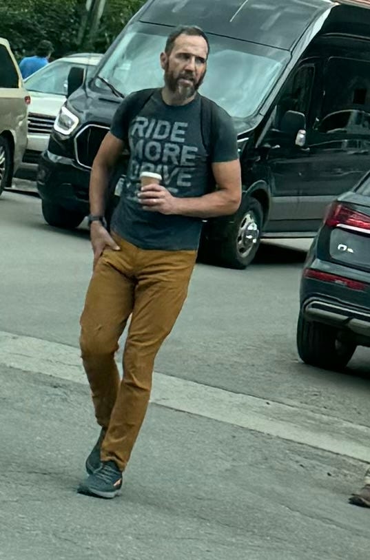 Smith is wearing a t-shirt that says Ride More, Drive Less - which is typical of the kinds of people who attend. They’re terrified of climate change as they fly here in their private jets, tap out tweets on the latest iphone and no doubt blast the air co at the condo.