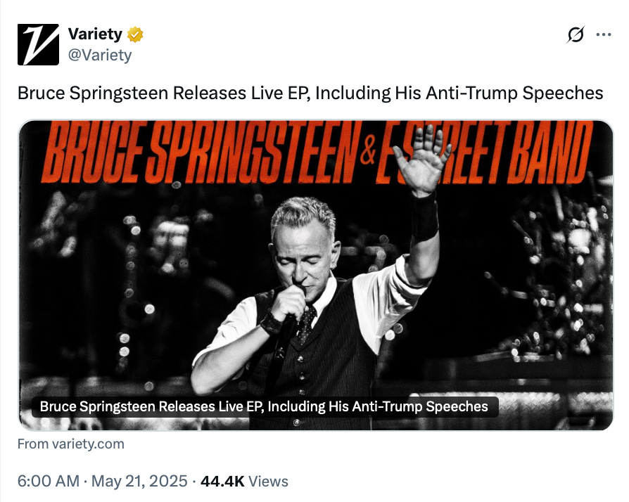 Meanwhile, Trump’s poll numbers are climbing, and who will buy that Springsteen record? I can’t even imagine it. Sitting there, rocking out to Thunder Road and hearing his garbled caw about Trump and feeling like yeah, that’s STICKING IT TO THE MAN! It’s cringe, is what it is.