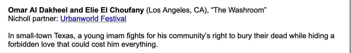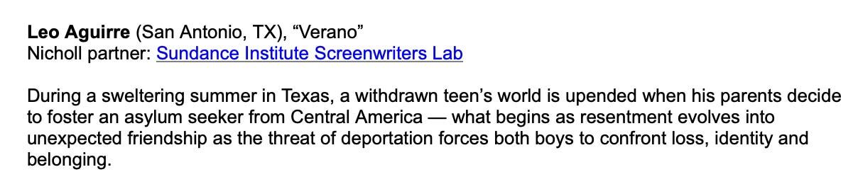 I got an email from the Academy of Motion Picture Arts and Sciences that announced the five winners of the Nicholl Fellowship, an annual screenwriting contest that sifts through thousands of screenplays to find the best. Here are two of the winners: