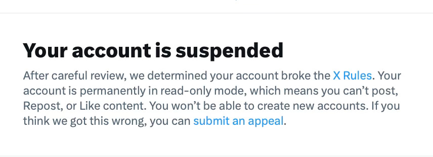 I did not break the rules. You guys have locked me out three different times. I’m just trying to use X. Why is it so difficult? My original account, @realsashastone was hacked by crypto pirates -- still can’t be used. I then started @sashastone26 and you banned me for impersonating myself. Now, I finally found a new way to have a second account, which is directly attached to my Substack and you’ve suspended that too. I am at a loss here. I have been a good customer for years. I have two premium subscriptions. I have written articles praising and defending Elon Musk. I use X all of the time. I do not understand why this keeps happening and no one in your company will get back to me or help me.