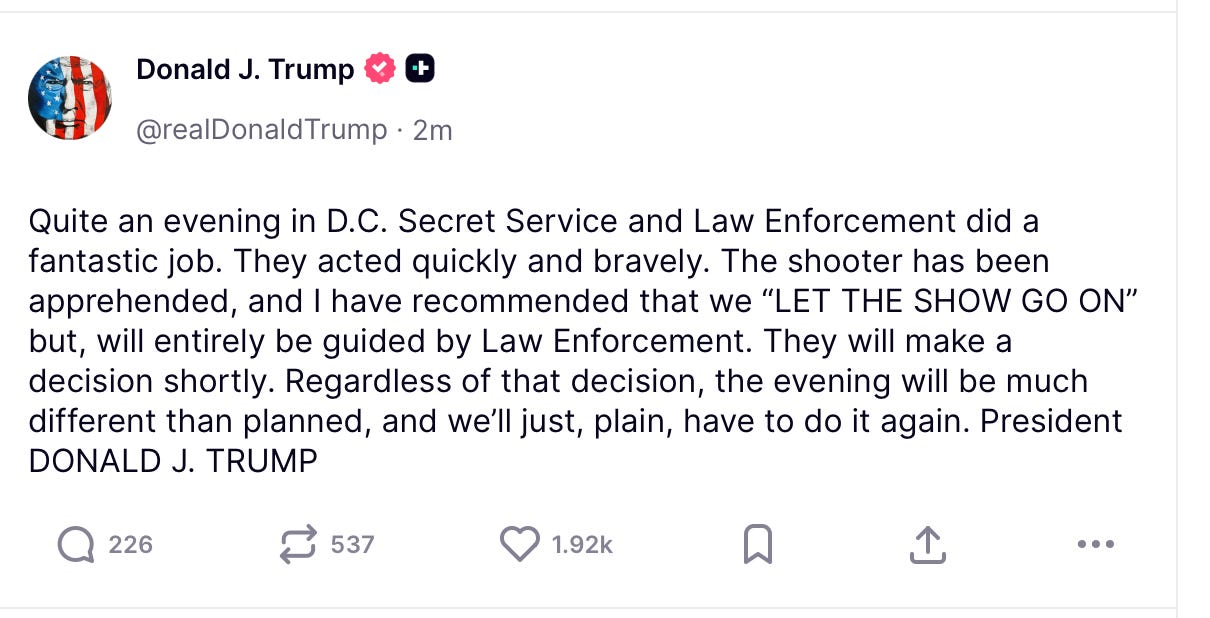 There were shots heard inside the White House Correspondents’ Dinner as Trump and his administration were quickly ushered out.