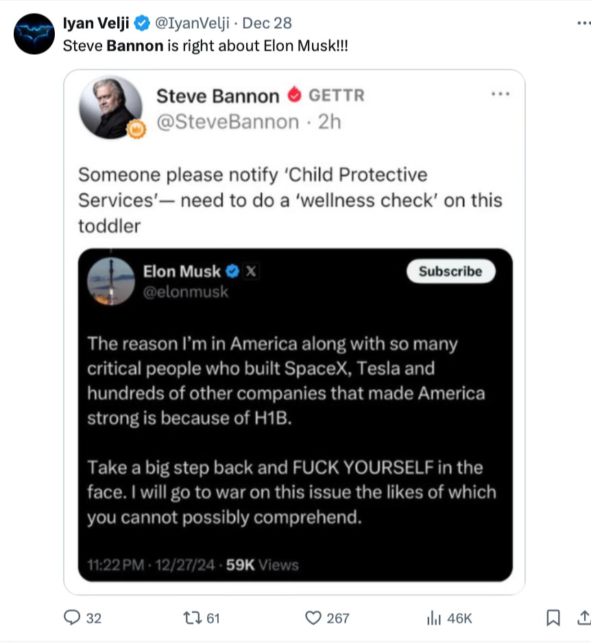 All of the people who are raging at Elon Musk now have always done so way before this debate - people like Steve Bannon and Batya Ungar-Sargon. Bannon has never liked Musk’s transhumanism exploration nor his cozy relationship with China. Ditto Ungar-Sargon, but for slightly different reasons. He’s populist Right, and she’s populist Left.