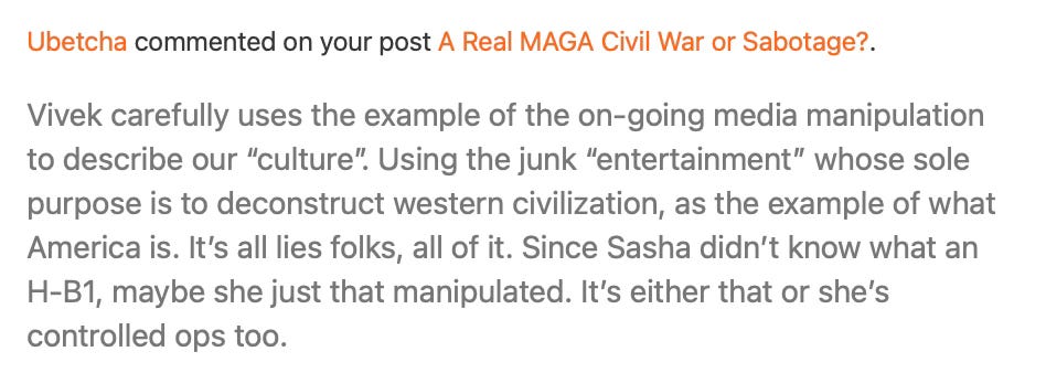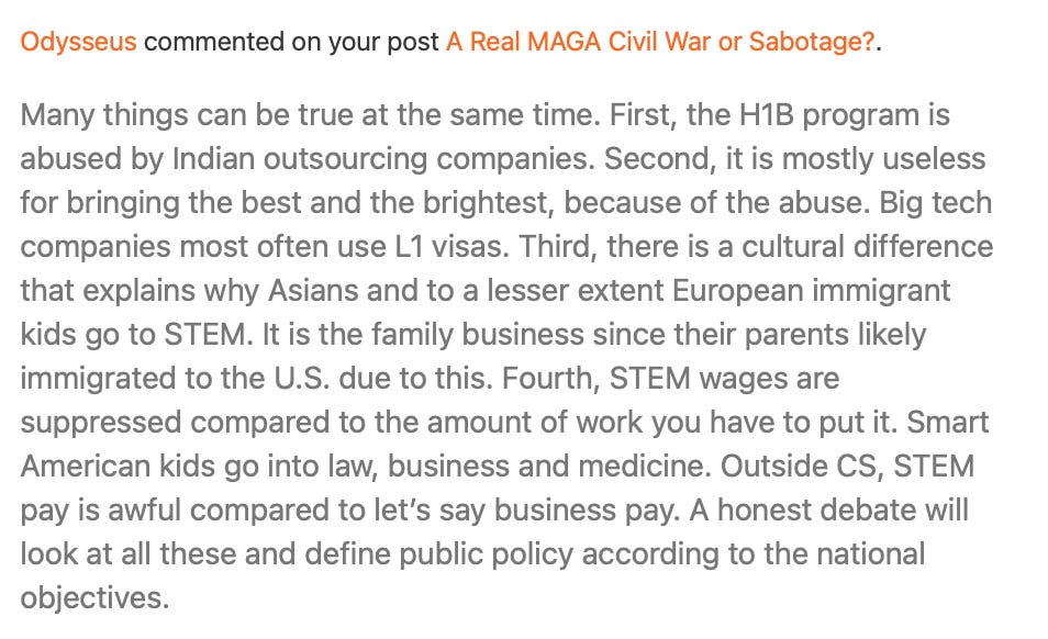 Ungar-Sargon is wrong when she says the American people voted against HB1 visas. It was not an issue. We were talking about the border, about illegal immigration, not legal immigration. But perhaps MAGA folks should have put that front and center since it suddenly appears like their most urgent and important issue.