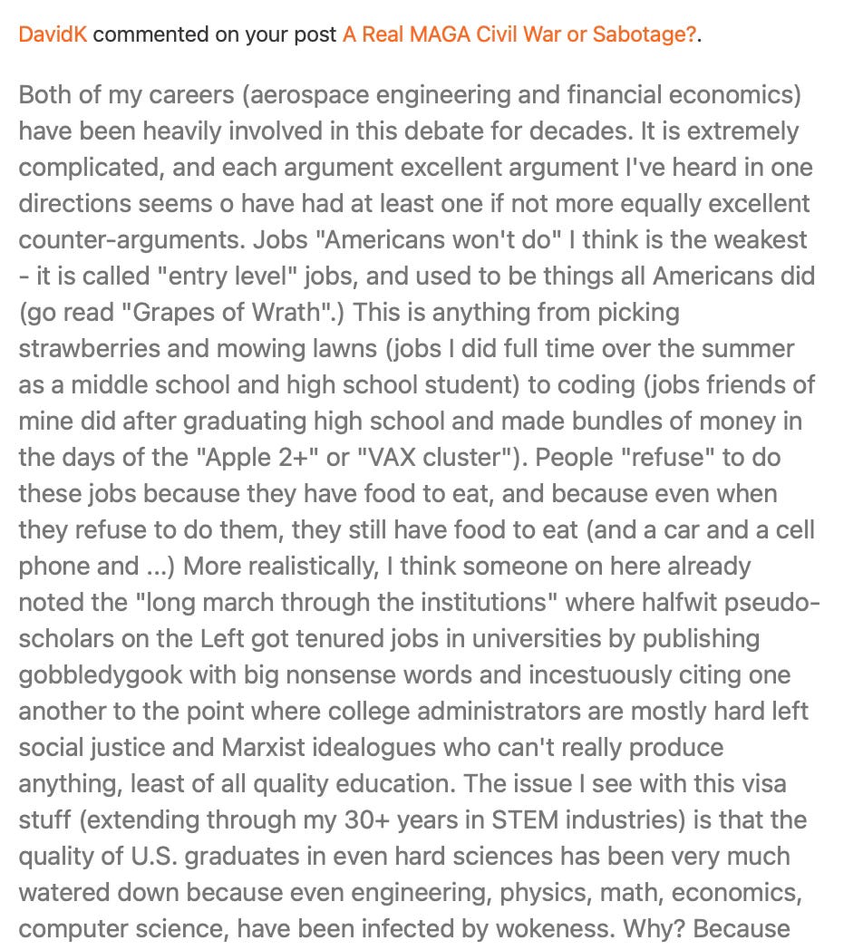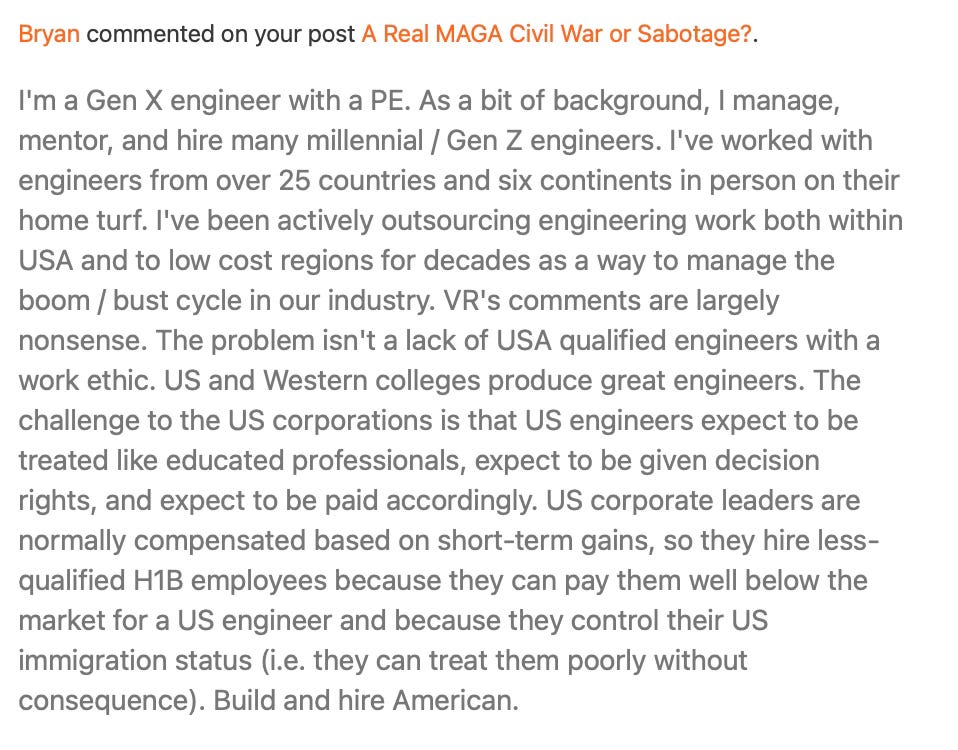 The Left always wanted to paint the Right as being anti immigration just because we are pro legal immigration. The truth is America First doesn’t mean you only ever have native born citizens do any and all jobs. It means let’s do what is necessary to make the country great. What’s becoming clearer is that the H1b visa program has been abused to some degree. Ok, so let’s not throw babies out with bath water and let’s make sure the process is more just and meritocratic and that in the effort to get the best and brightest we don’t discriminate against native born citizens and/ or create more chain migration. It can be done with legislative adjustments from the new congress so let’s get to it. And let’s revel in the reinvigoration of real debate amongst all participants in the quest to make this country as good as it can be.