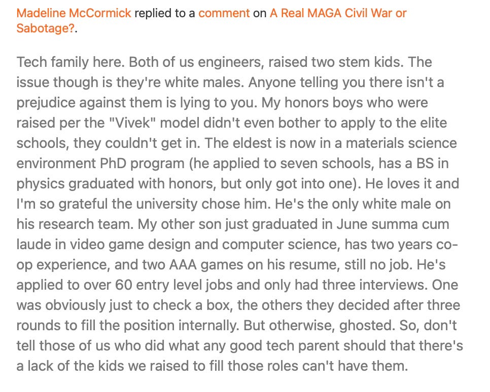 Here is what I do know. There is a massive alignment of very powerful and influential people who are just waiting to say, “I told you so.” They’re waiting to relish watching MAGA tear itself apart, especially watching them turn on Musk after all he’s done to diminish their monopoly on information. They’re waiting to win back Big Tech by giving them what they want. And MAGA will lose again.