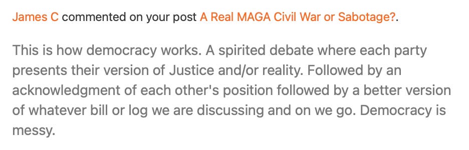Don’t you just love the way those outside of Trump world( still reeling from his victory) are couching the visa disagreements as ‘civil war ‘ in the MAGA movement. No, this is what honest debate looks like. It’s going to be messy because representative democracy is messy and having candid, uncomfortable but well intentioned disagreements among those who want to make a better country is the lifeblood of a free and independent thinking citizenry. The very fact that people in the new Republican Party can air these differences freely, sets them apart from the Democrat party which is famous for its robotic, lockstep unanimity… even as they walk synchronously off the cliff.