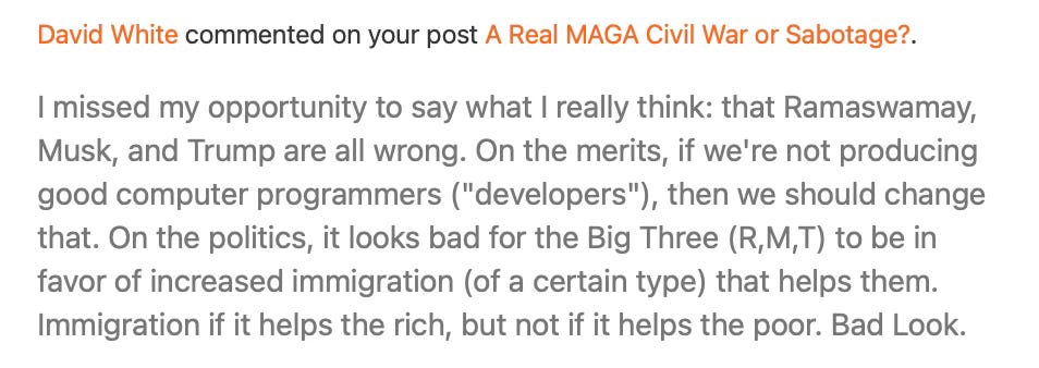 I will die on the hill saying that I have probably seen nothing more politically unwise (to put it mildly) than to help the Left weaken the Right by taking shots at the tech bros over labor right now before Trump takes office.