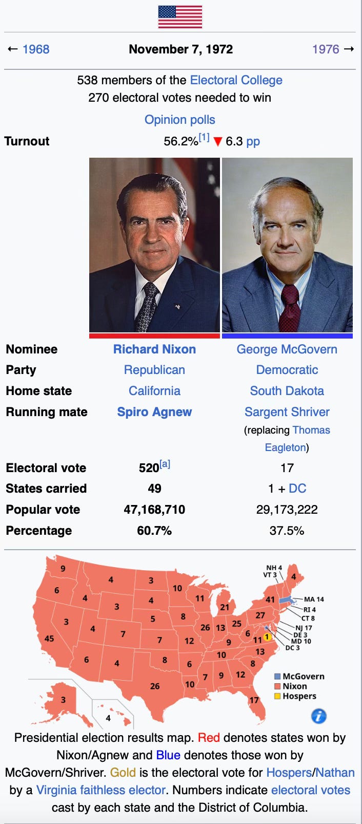 The Left wasn’t ready to give up power in 1972, despite the historic beatdown. It was too easy to write it off as ratf*cking by Nixon. The Canuck Letter destroyed Edmund Muskie’s career as Nixon helped elevate George McGovern.