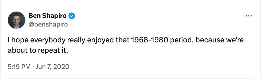More specifically, the swing between 1968 and 1980, as Ben Shapiro has often discussed in books and on his podcast. His comment was one of the things that drew me to the Right because, finally, someone said something that made sense. He tweeted this in the Summer of 2020, though it would be four more years before 1980 actually arrived.