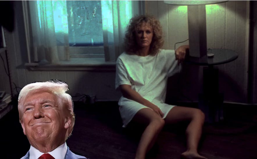 Right now, the Democrats are slowly becoming the stalker ex, obsessing over everything Trump says and does, but it will get them nowhere. Who will want to vote for someone like Glenn Close, listening to Madame Butterfly and turning the lamp on and off in Fatal Attraction?