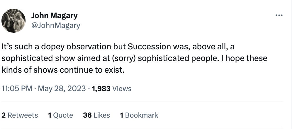The #resistance wasn’t all of Succession’s audience. Plenty of Conservatives watched and enjoyed the show for its great writing, directing, and acting — because, trust me, in today’s media landscape, it is a unicorn.