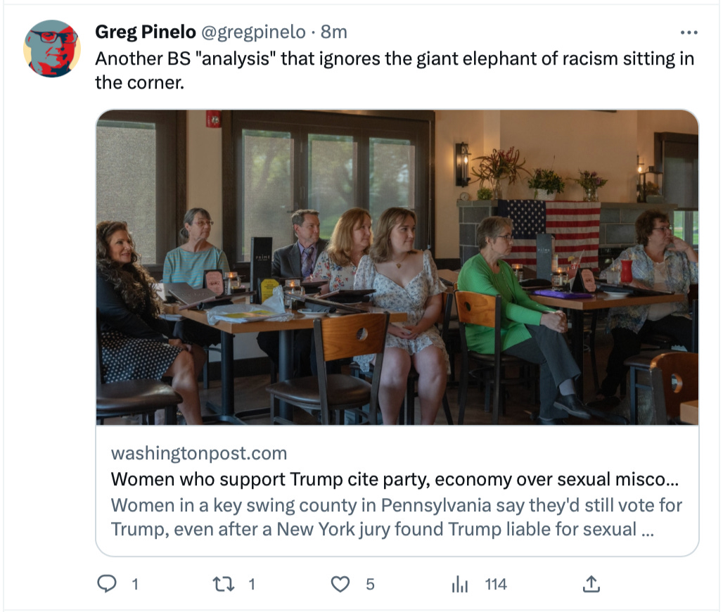 The tweet by Greg Pinelo that says, “Another BS analysis that ignores the giant elephant of racism sitting in the corner.” The tweet refers to a Washington Post story with the headline, “Women who support Trump cite party, economy over sexual misconduct.”
