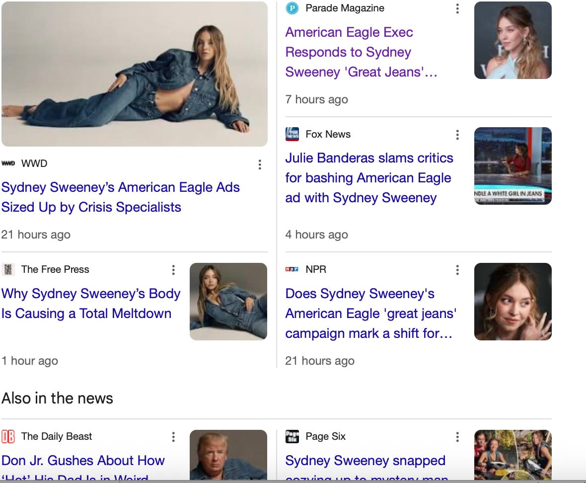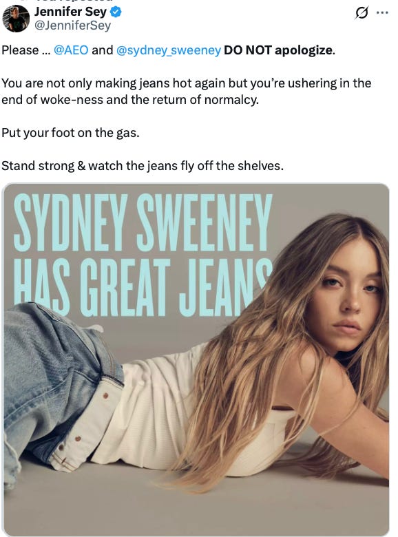 Instead, Sweeney was celebrated, American Eagle’s stock soared, and most importantly, the Puritanical Woke scolds have never looked more ridiculous.