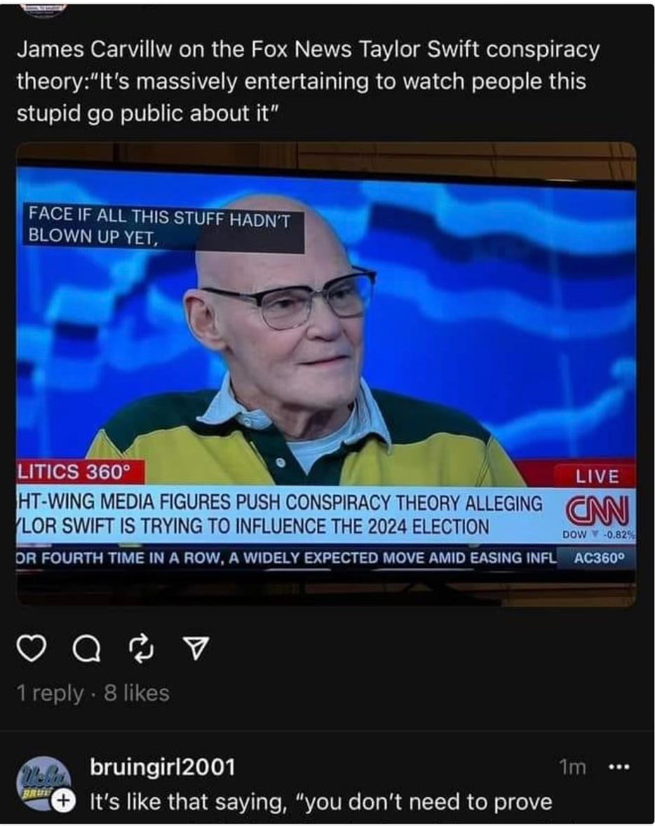 “FINE! This is my very last offer. How about Travis and Taylor come to the White House? Maybe she’s helping him with some charity for trans teenagers or teenagers who want an abortion or something like that. And maybe someone special pops out of the closet.”