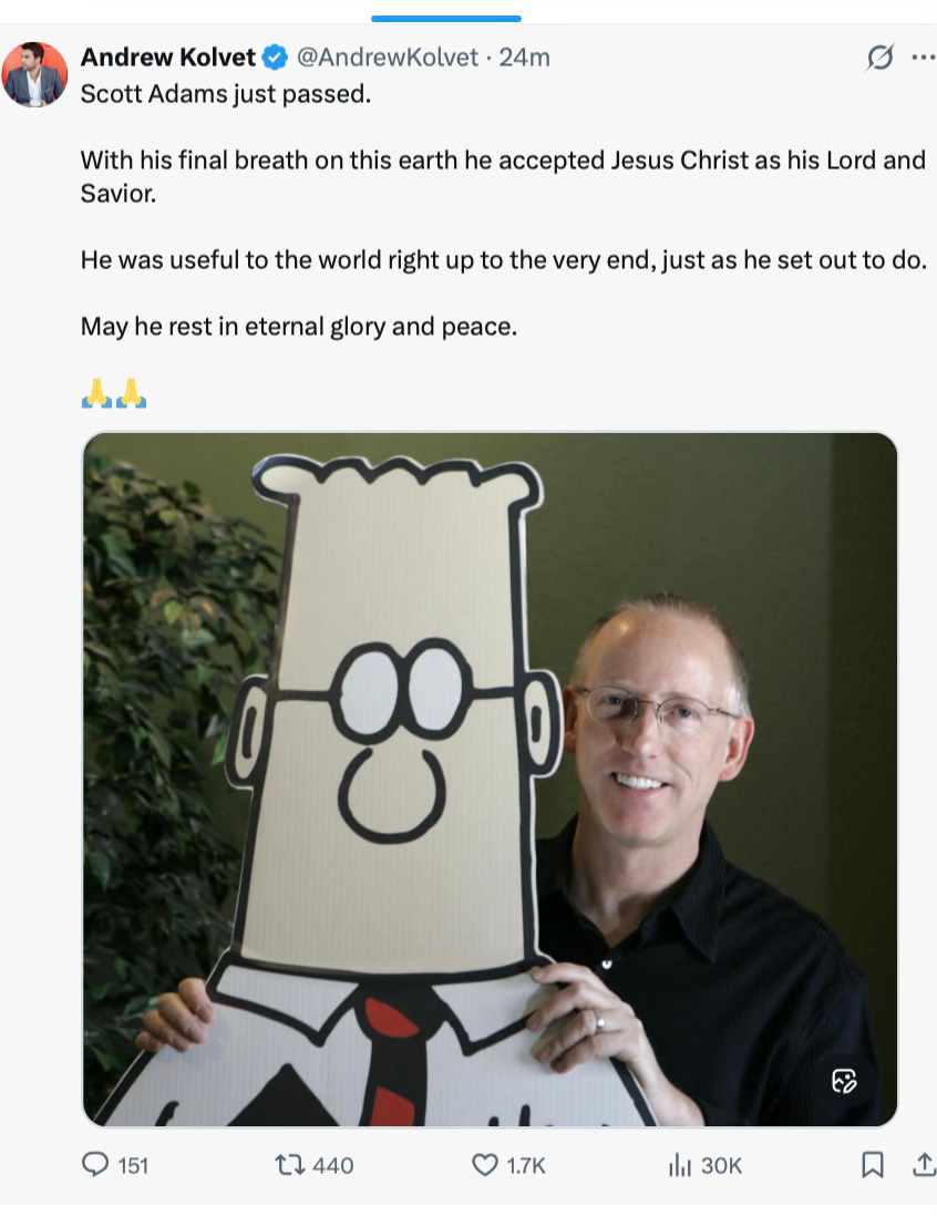 It is no country for free thinkers, that’s for sure, and you couldn’t find someone with a more open mind than Scott Adams. He wasn’t just the guy who drew the Dilbert comics - he was a philosopher and thinker. He will be greatly missed.