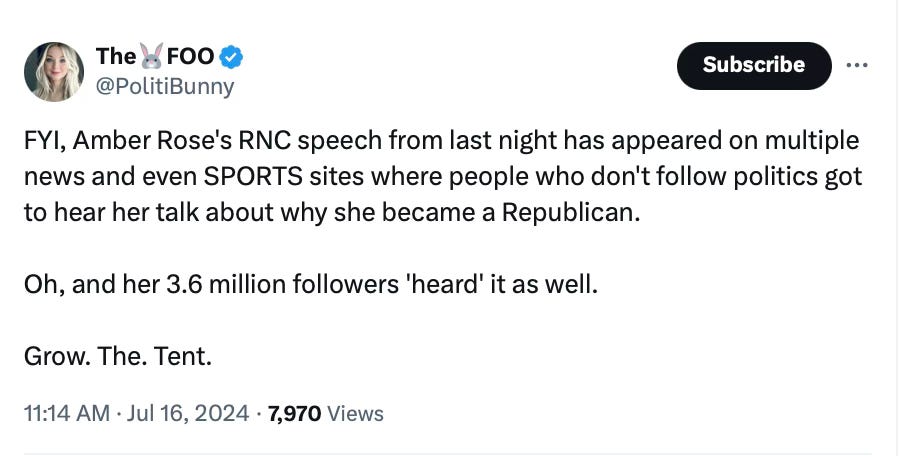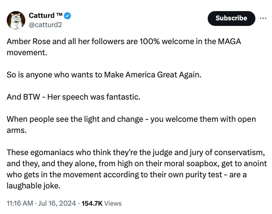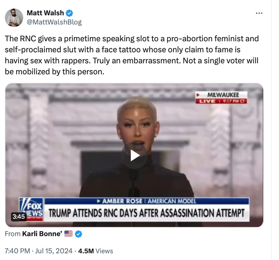 I think Amber Rose is beautiful, whether she has tattoos on her body or not. But I also appreciate that she covered them up with a respectable black turtleneck to make a speech at the RNC. Guys like Matt Walsh can’t make me think less of her. I understand where he’s coming from, but his side is not going to win both their traditional hard line and the 2024 election.