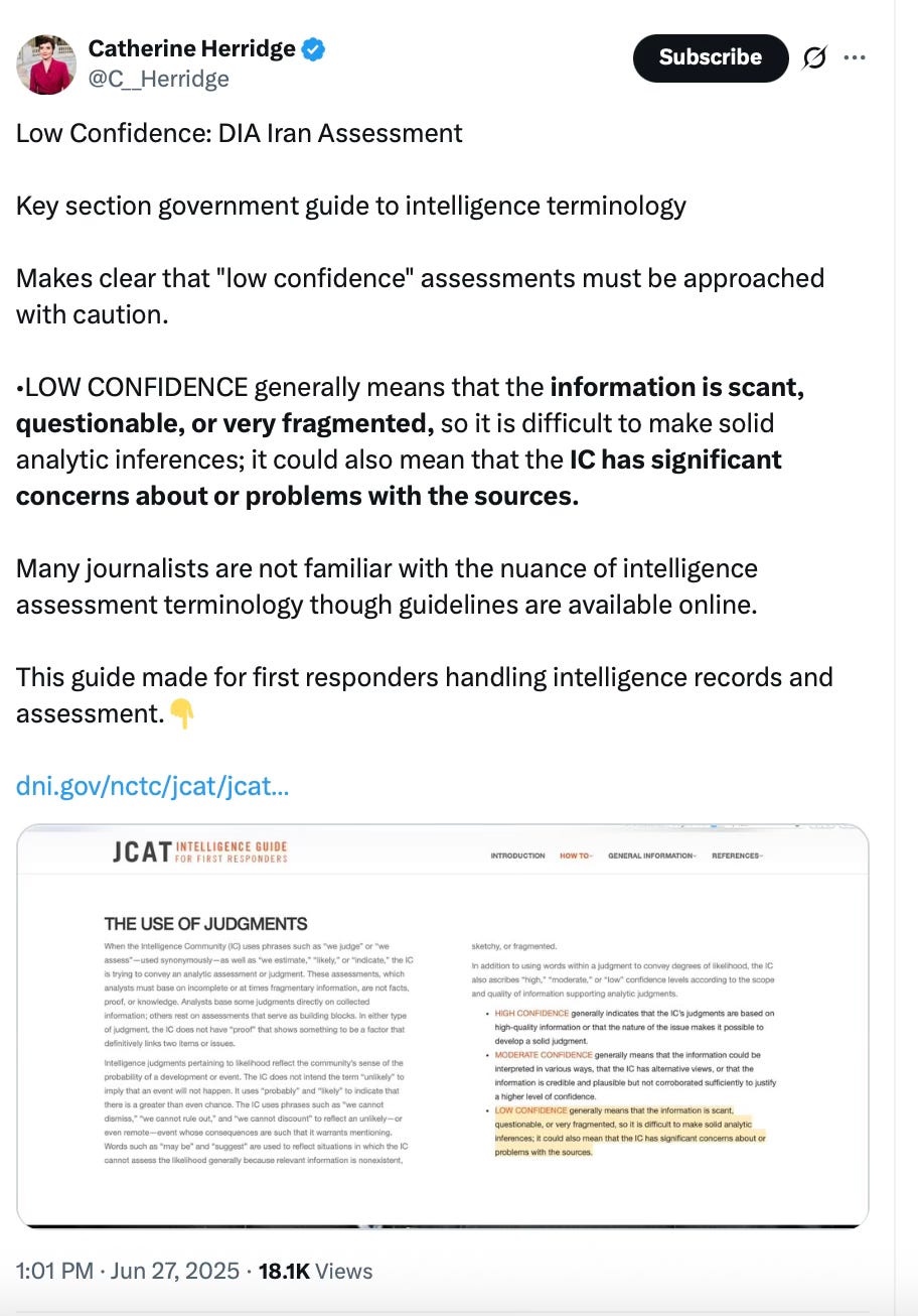 One of their favorite conduits is Natasha Bertrand at CNN, who was an easy mark to spin the narrative the Democrats needed, that Trump and Operation Midnight Hammer had failed:
