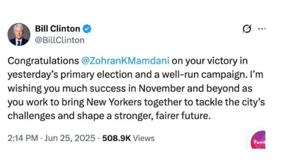 After Mamdani’s win, it was all quiet on the Leftern Front. Bill Clinton was the first to weigh in. It was like cautiously approaching a coiled rattlesnake. Don’t make any sudden moves.