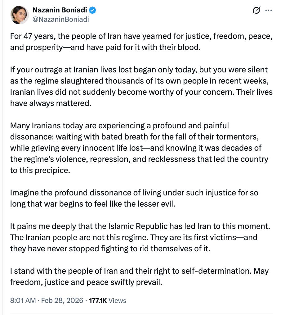 Pshew, it all needed saying just as you said it ... A religious monster has been terminated, sadly too late, especially after the slaughter of dozens of thousands of Iranians striving for their freedom ... For many who love our innate desire for individual freedom, the most universal of all our attributes, the elimination of one of the most evil religious tyrants the world has seen is hopefully a warning to others who also seek to suppress freedom, that which is essential for the celebration of Life ... Persia may yet rise again and it's past magnificent culture blossom again ... Albeit on the enormous sacrifices of genuine martyrs, women who sought to be free to choose how they wished to live, the men who perished along with them whilst the Western Left and the Global South stayed silent as madmen slaughtered them ...