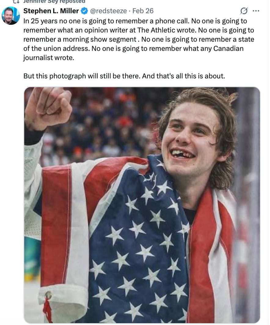 I expect many of those hockey players who won the Gold are now seeing it too, as so many bitter harpies whine about them, punish them, attempt to shame them for having attended the State of the Union. I hope they now realize that these are people who are only happy when everyone is as miserable as they are. They were on SNL on Saturday. We’ll have to see how that goes.