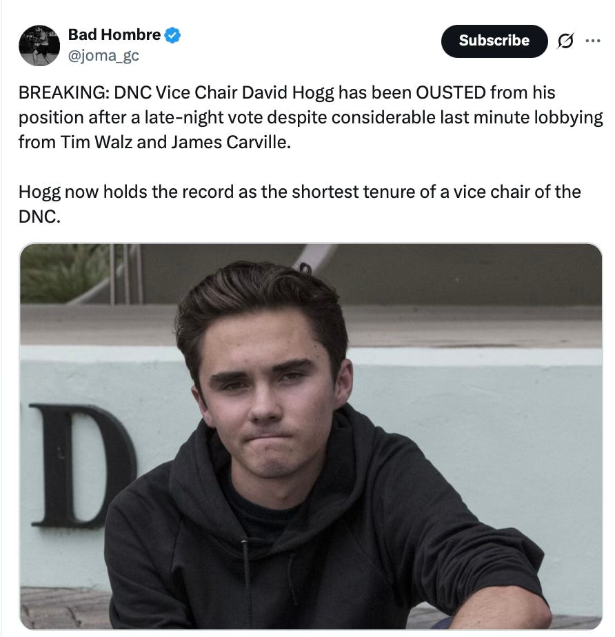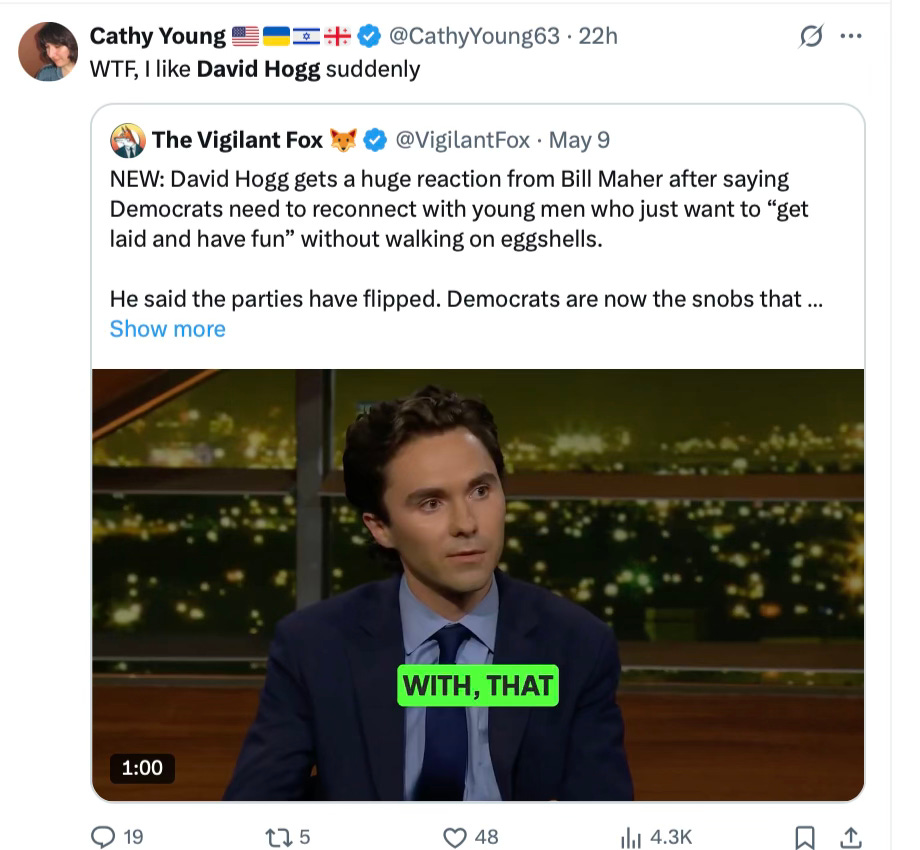Then, there was David Hogg on Bill Maher, pretending it’s possible to bring some sanity to the party so young men can “get laid and have fun.”