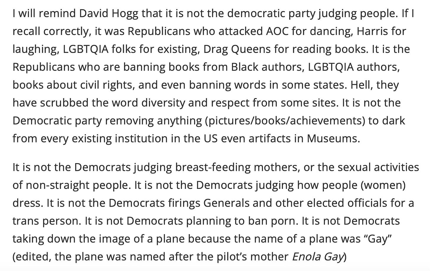 That March story about Enola Gay was part of an electronic preliminary pull that flagged certain words that might unearth woke content. That didn’t mean Pete Hegseth banned it. As with the children’s book by Julianne Moore, it was put in the “to be looked at” pile, but that didn’t stop the headlines.