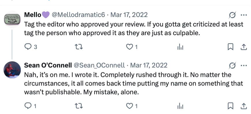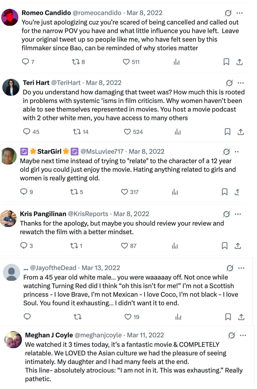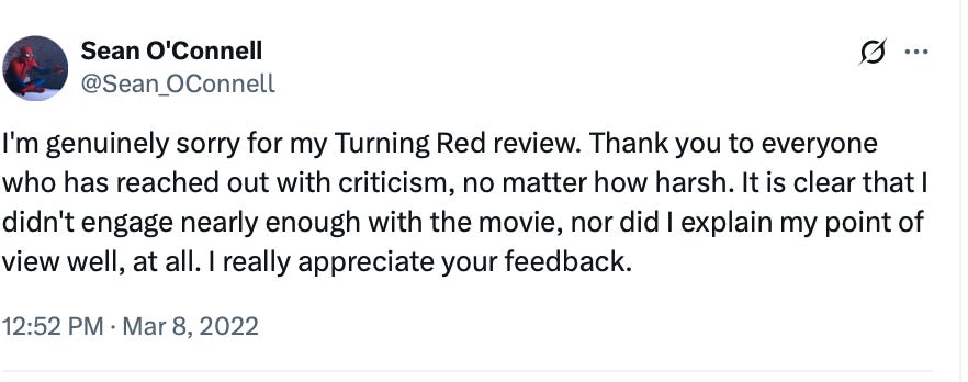 Speaking of mania, I’ll never forget how a film critic named Sean O’Connell once wrote a film review about Pixar’s Turning Red. He didn't particularly like the movie because he wrote from his perspective (normie white dude). The attacks came fast and hard, from young Asian girls who had begged for representation in movies, to the scolds on Twitter. Then came the agonizing op-eds. By the end, he didn’t lose his job, but he almost did. He had to apologize and take down the review.