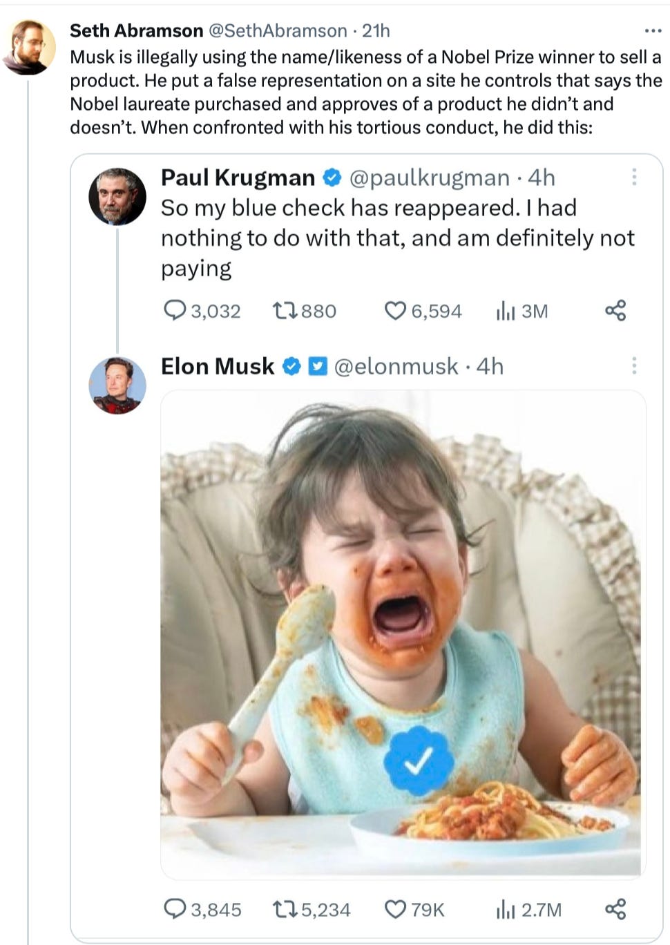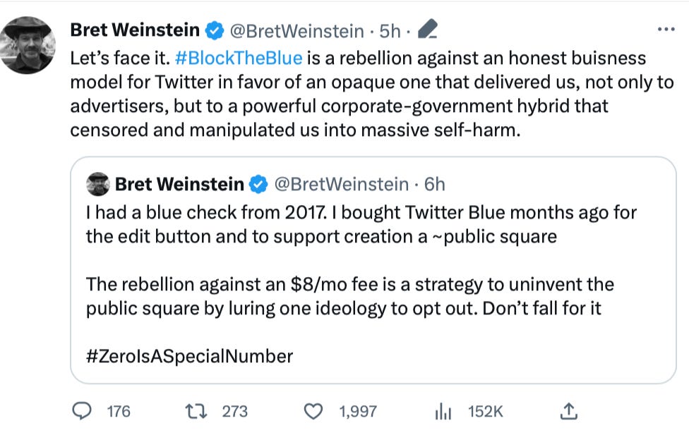 Elon Musk played a game of cat and mouse with the blue checks first by taking them away, then giving them back after they launched a dumb hashtag campaign because the “unwashed masses” could now have access to status on Twitter. It was obscene but telling.