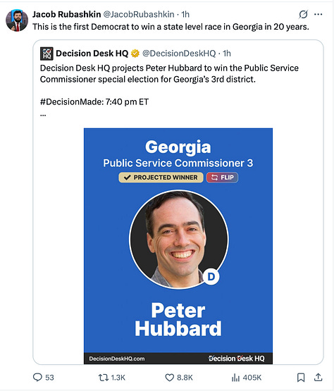 I know the mainstream media / DNC Communications Office (but I repeat myself) are spinning this as some great repudiation of Trump and the GOP - but take a step back and look at what actually happened: The Democrats beat back Republican challengers in Democratic strongholds. New York, New Jersey, California. Retook a governorship and AG in Virginia that the Republicans only managed to win because of the Democrats' war on parental rights an election cycle ago.
