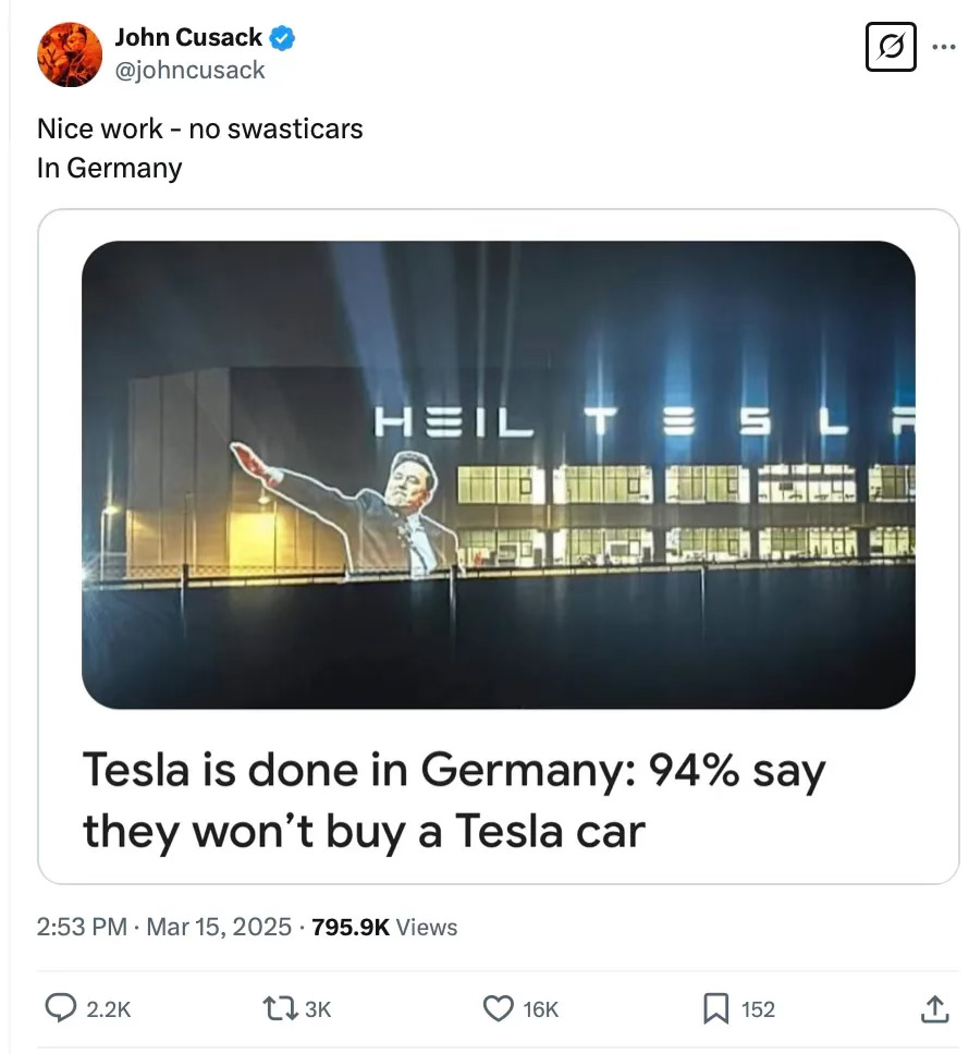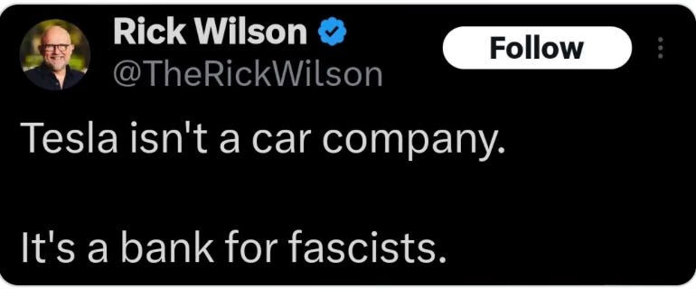 In their fever dream—and I promise I am not exaggerating, not even a little bit—they believe their acts of terror and vandalism against Teslas will bring down the company and force Musk into bankruptcy, so he will have to sell Twitter/X because they believe it was stolen from them.