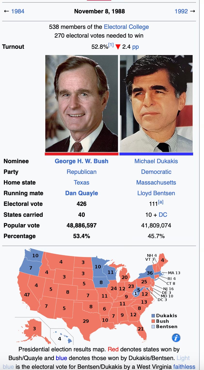 With Gary Hart out, the Democrats were left with Michael Dukakis, who lost to HW Bush in a near-landslide: