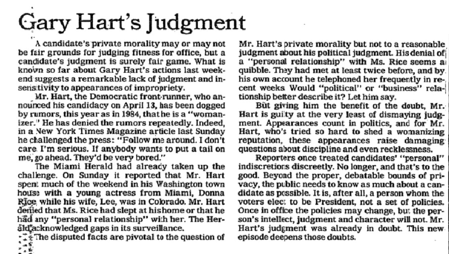 There were still enough traditionalists for Hart’s behavior to matter when it came to winning an election. One of the many ways things were so different back in 1987, was that the New York Times Editorial Board actually criticized a Democrat: